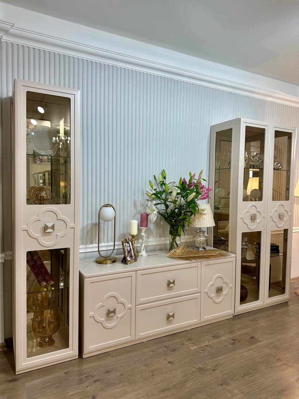 - Функциональность - витрины укомплектованы стеклянными и щитовой полкой. Тумба ТВ - с ящиками и фасадами - идеально решение для хранения столового текстиля и столовых приборов. Большой комод удачное и функциональное дополнение и гостиной и спальни.